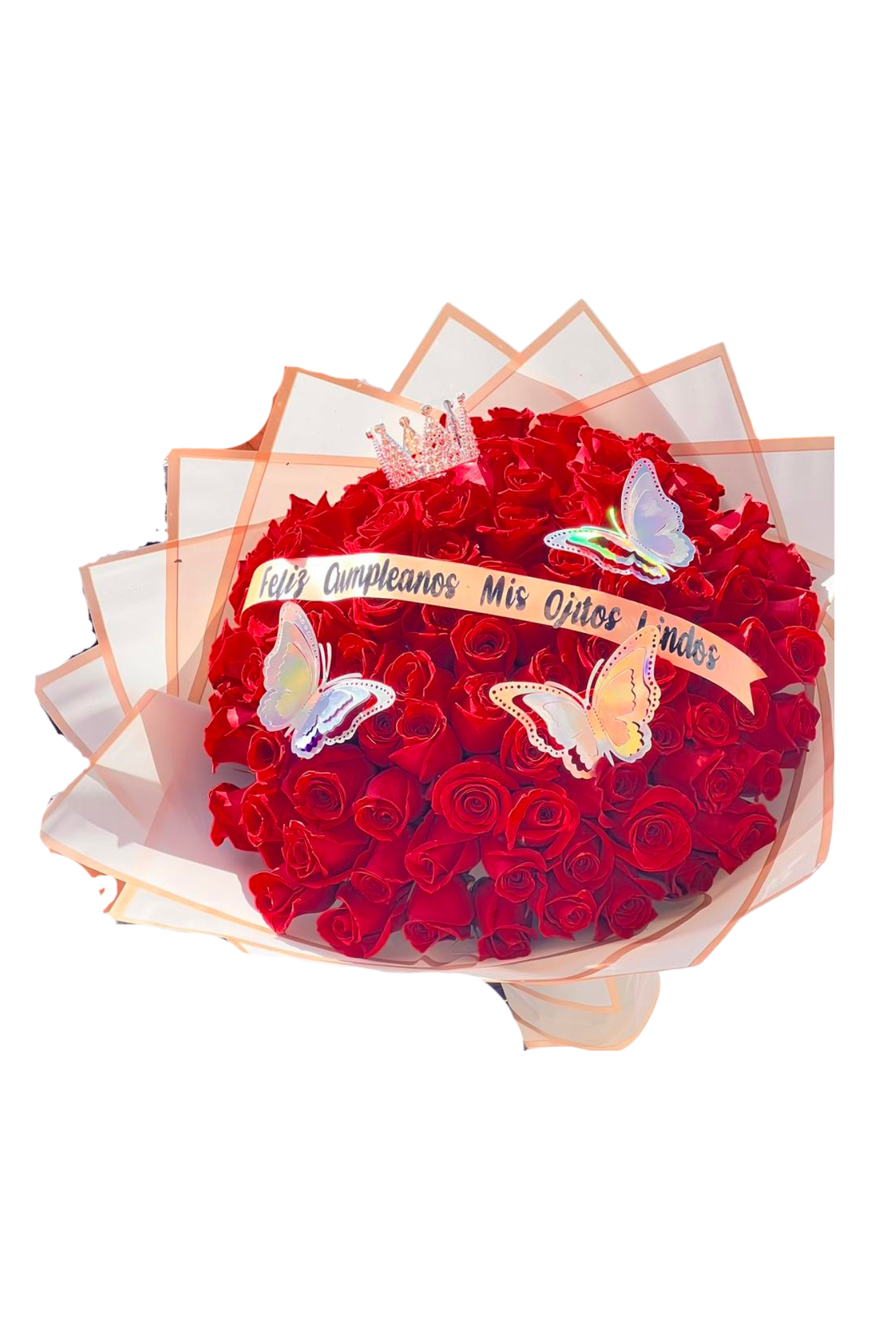 Un bouquet majestuoso de rosas rojas con detalles brillantes, mariposas y una corona encantadora. Un regalo creado para celebrar a quien merece sentirse como realeza.