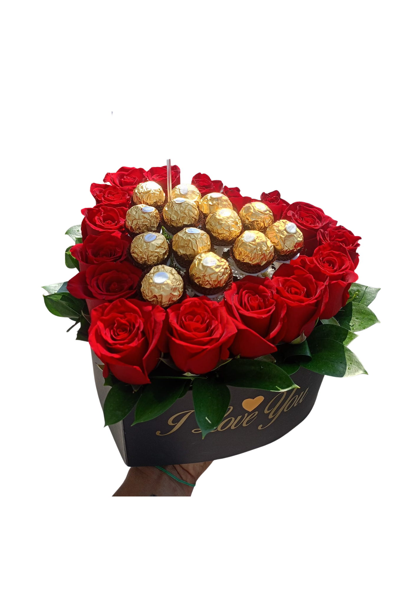 Un detalle apasionado y elegante, compuesto por rosas rojas frescas y deliciosos chocolates Ferrero, presentado en una caja en forma de corazón para expresar amor puro y auténtico.