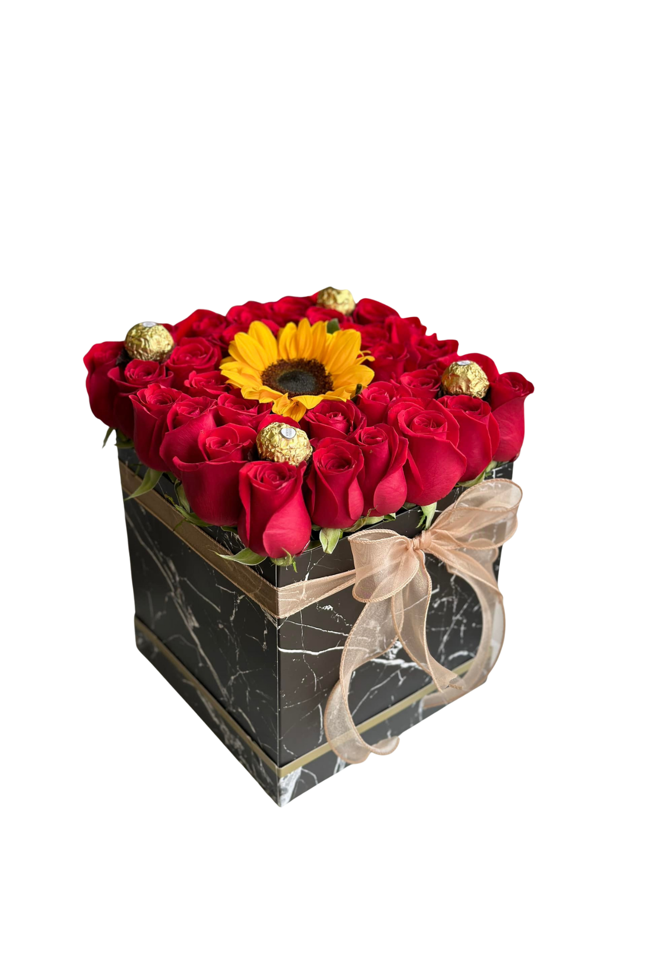 Un elegante arreglo que combina la pasión de las rosas rojas con el brillo dulce de chocolates premium y un toque de luz con un girasol central. Un detalle sofisticado para sorprender en cualquier ocasión.