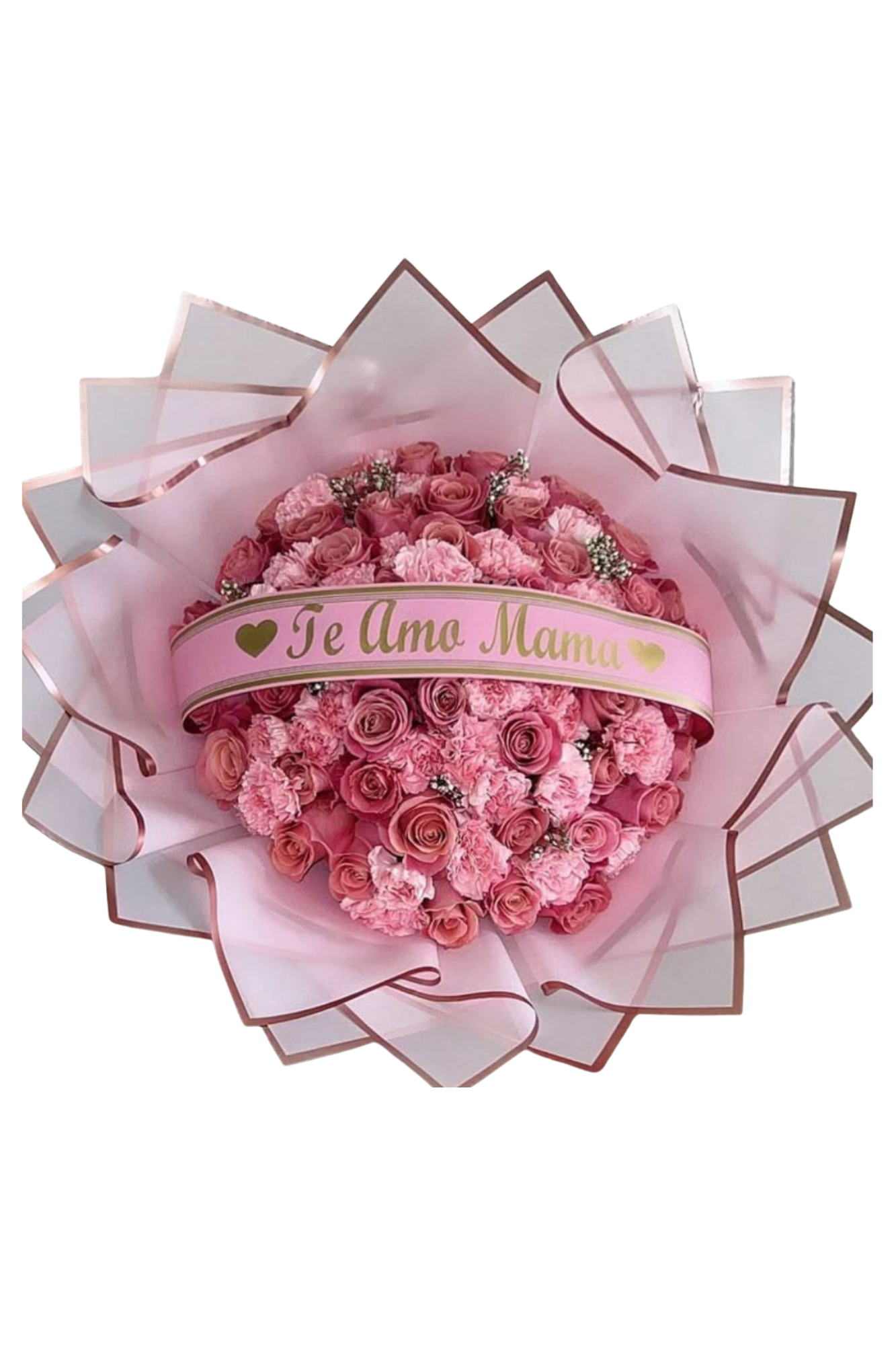 Una mezcla armoniosa de rosas rosadas y claveles en suaves tonos pastel, envueltos en un fino papel con bordes metálicos que realza su belleza y elegancia. Al centro, una banda con el mensaje “Te Amo Mamá” convierte este arreglo en un gesto profundamente emotivo, perfecto para celebrar a quien siempre da amor sin medida.